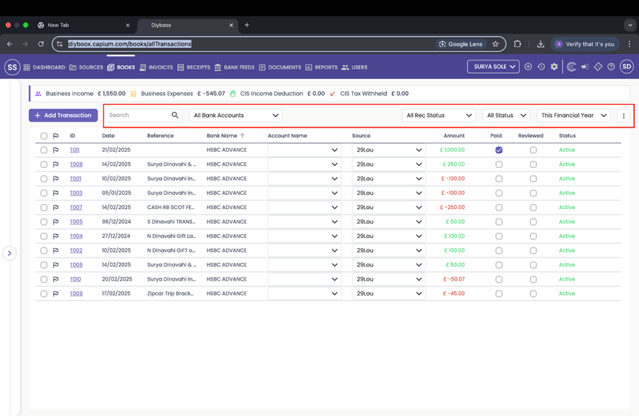 - Search: Enter any characters to quickly locate transactions across all recorded data, including references, amounts, and sources.