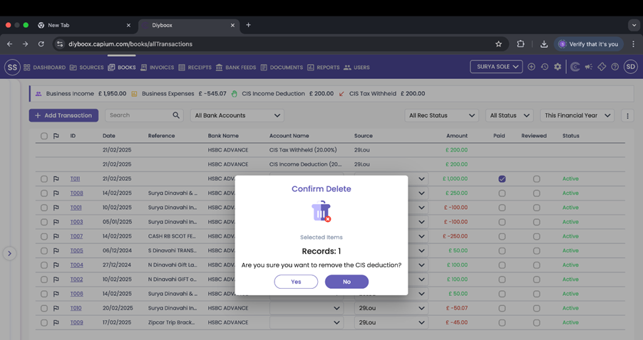 Navigation: Capium 365 > Books Find an income transaction which you want to remove the CIS deduction from > Click the – icon on the right hand side of the transaction > Click “yes”