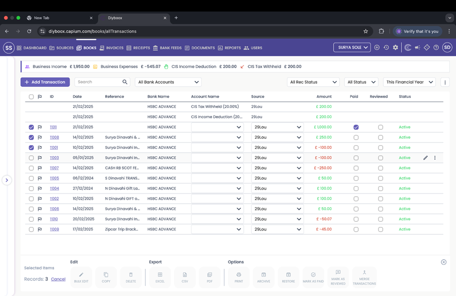 Navigation: Capium 365 > Books > Check the boxes on the left you want to edit > OR > Click the check box in the top right to check all transactions > Select “Bulk Edit” > You can change the “Source” and “Account Name” > Select “Save”