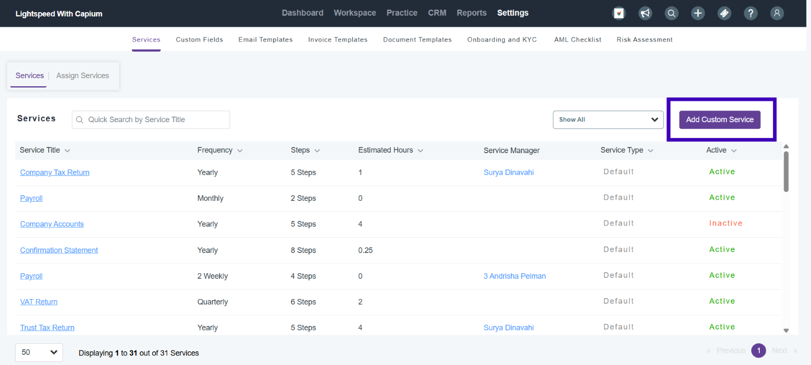 Once in the ‘Services’ section, you will be able to see all the default services. You can add in custom services with the purple ‘Add Custom Service’ button.