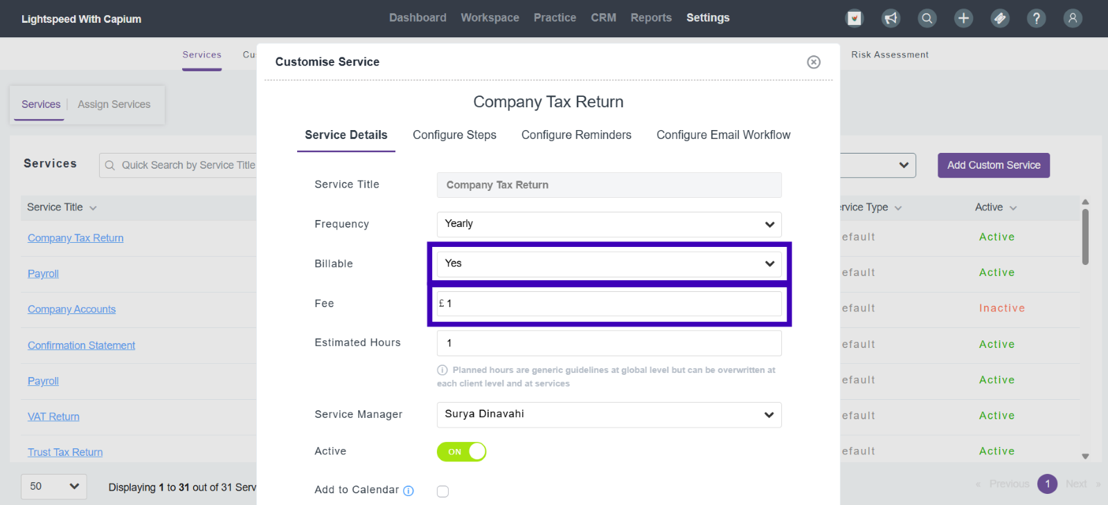 To adjust the fees on default services you must click on the Service Title of that task - ‘Company Tax Return’, for example.