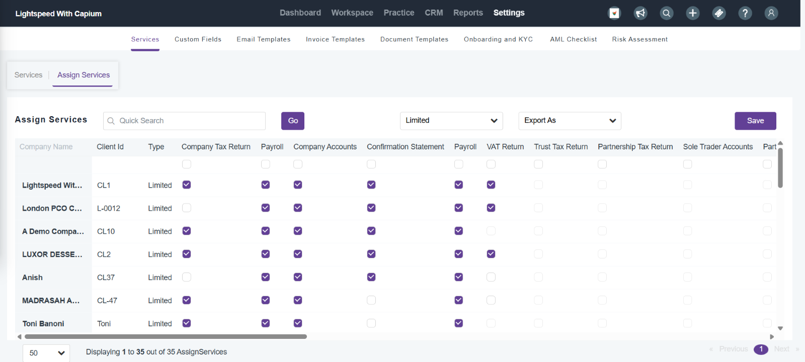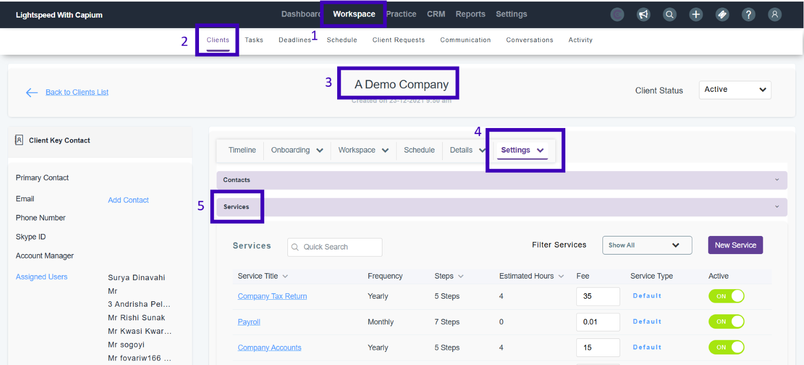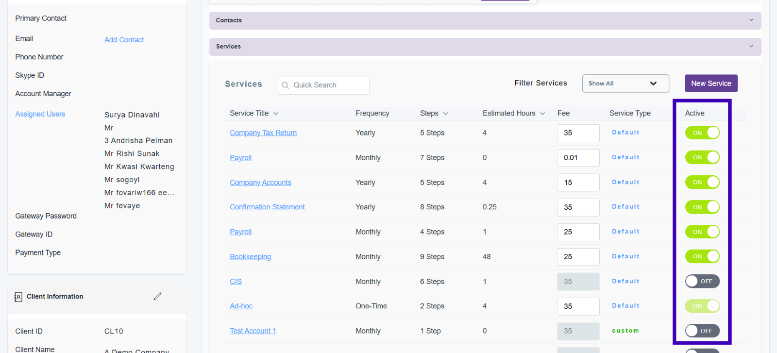 In this section you will be able to see all the services you have assigned to that client. You can toggle these as ‘Active’ for them to be used for that client.