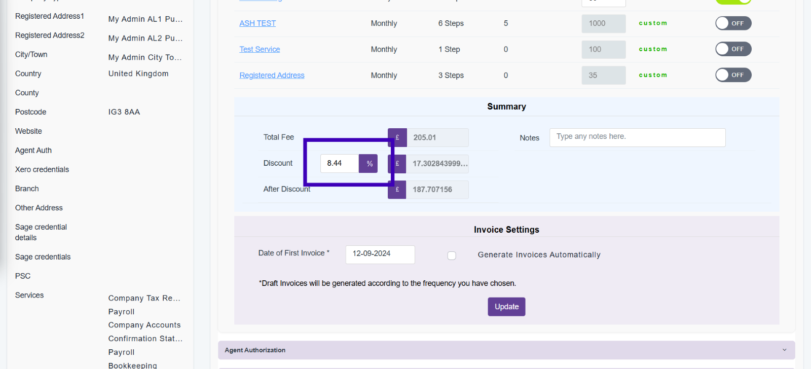 Also, within this section you can give percentage discounts on the total amount of the services.