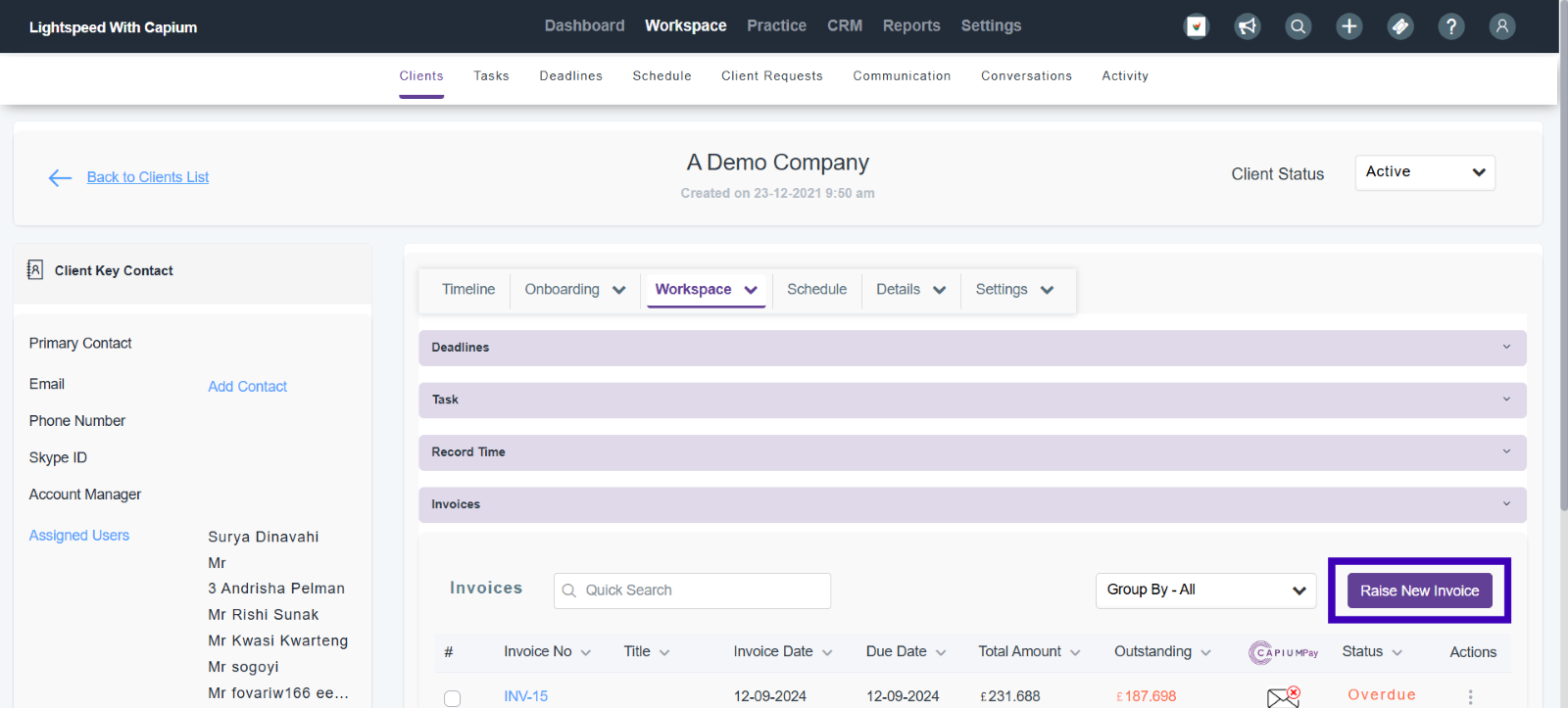 This will take you into the Practice section as seen in Raising Invoices – Company Wide, however you will not be able to change the client in this screen.