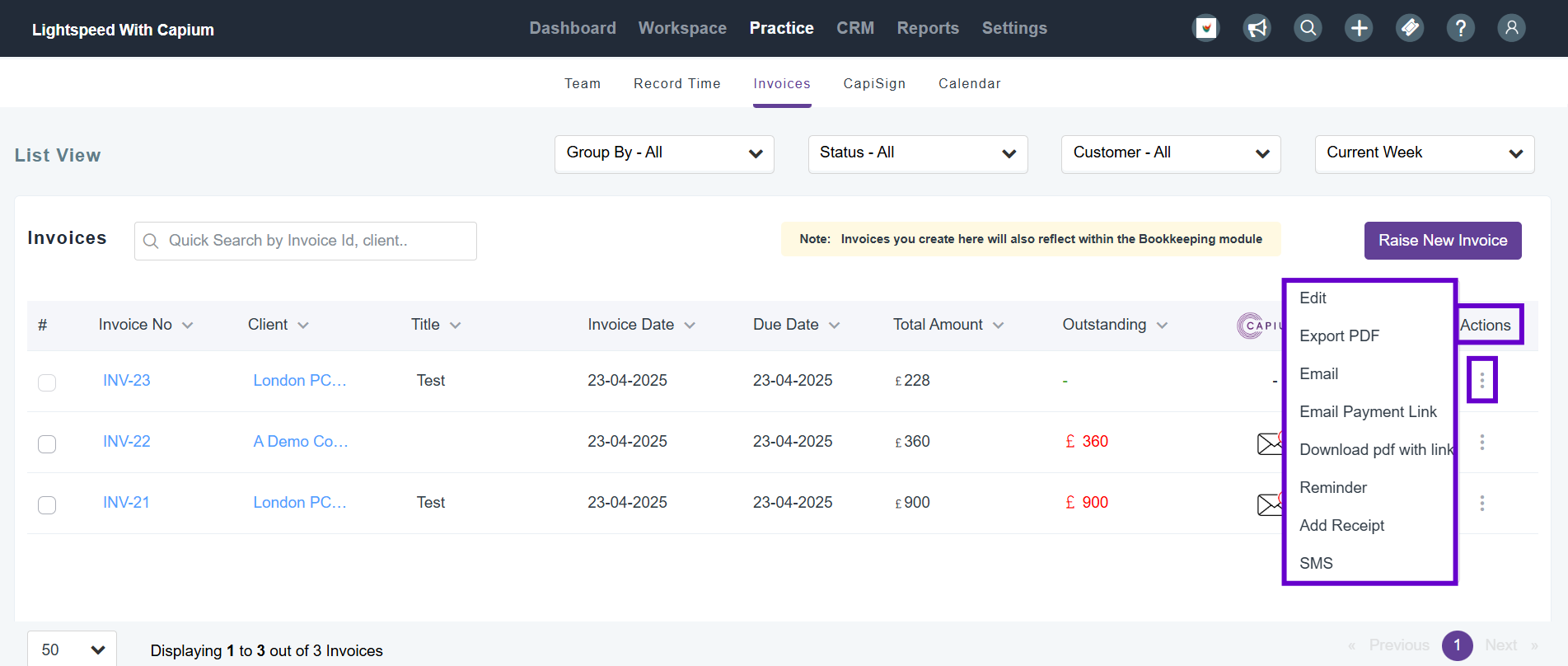 Once you press save it will take you back to the main company wide invoice area, you can click on the 3 dots below Actions and select one of the following: Edit, Export PDF, Email, Email Payment Link, Download PDF with link, Reminder, Add Receipt, and SMS.