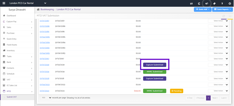 Note: You can also send out your VAT submission directly to a client via CapiSign using the Action dropdown.