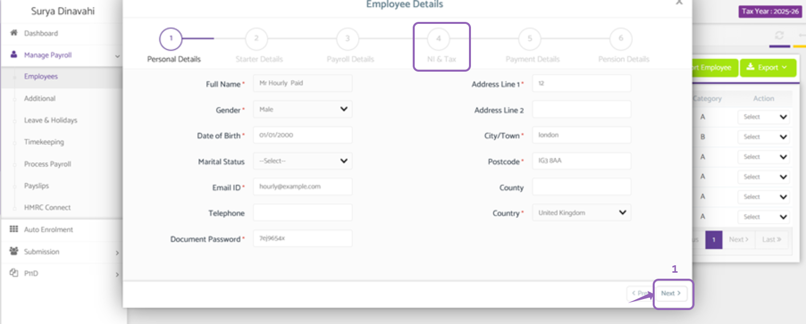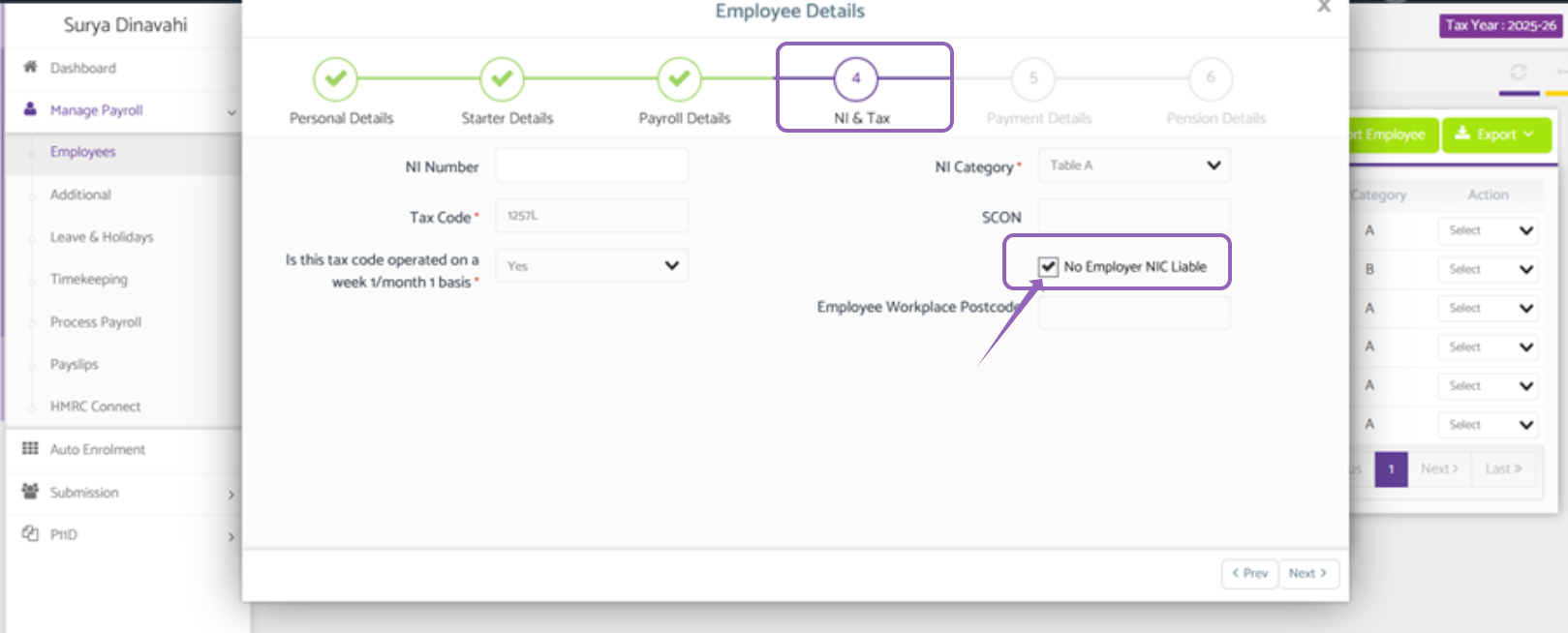 - You will now see a pop up with ‘Employee Details’, navigate to tab 4 'NI & Tax’