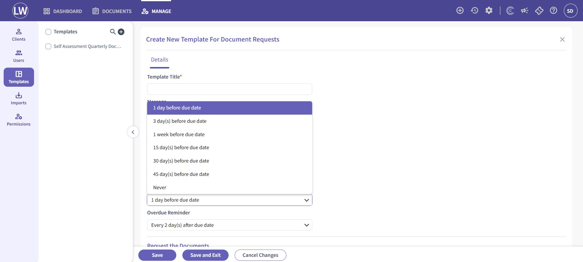 Once you have selected your due date when sending out your documents, you'll be able to set up a reminder based on frequency using the drop down.