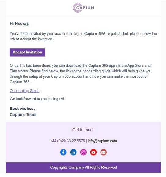 Please Note: Inviting a client to use Capium 365 will take up a license, regardless of the client accepting the invite. Please ensure you delete the clients who are not using Capium 365 in order to reassign the license.