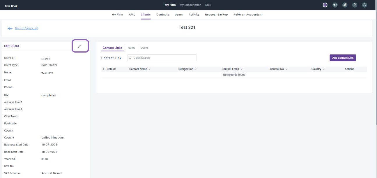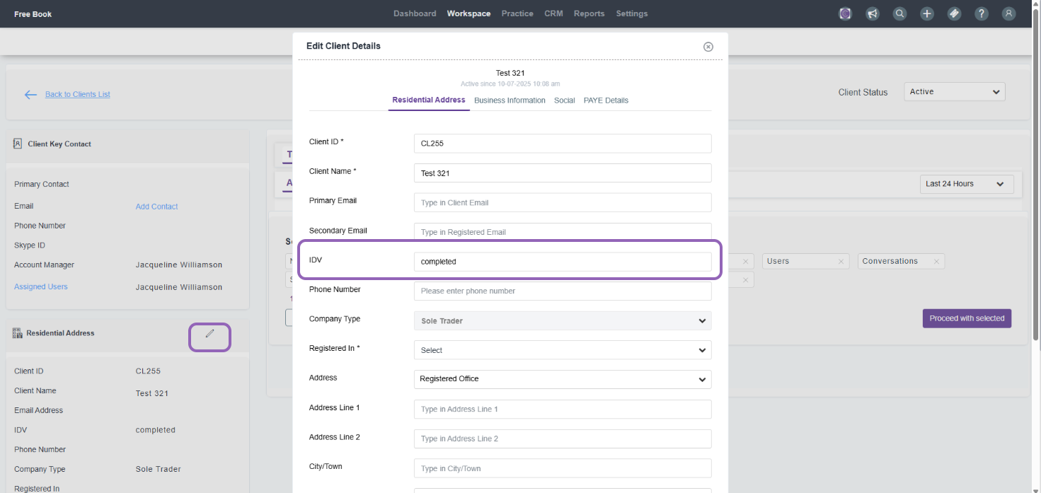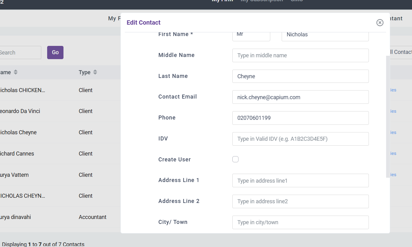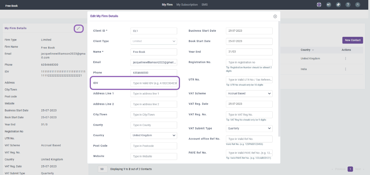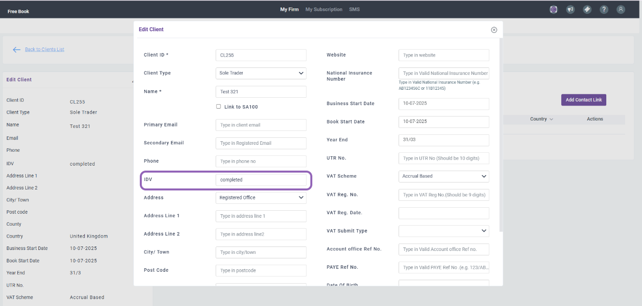 IDV details can be easily managed across different sections of the platform. Your firm’s own IDV information should be entered in the "My Firm Details" section within the My Admin. For individual clients, IDV details can be added and managed directly within the Clients section. You can also record and update each client’s IDV information through the Practice Management module, ensuring all records are securely maintained and easily accessible as part of your daily workflow.