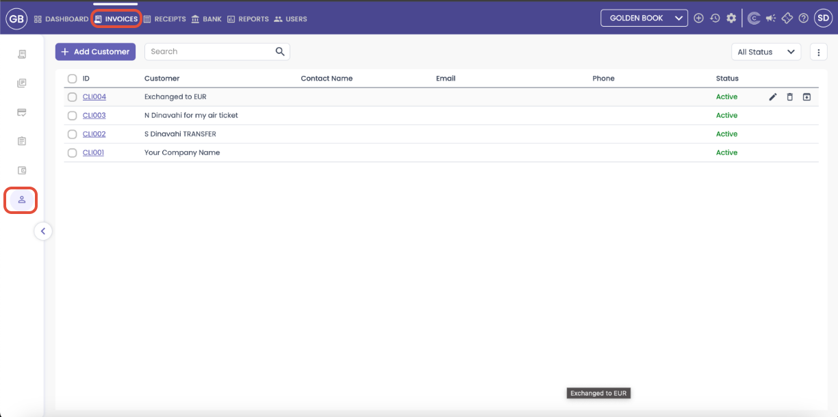 The customers section is the client database within the invoicing module. It stores all customer-related billing info and links directly to invoices, estimates, and credit notes.