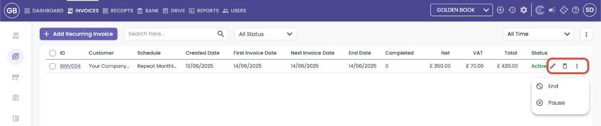 When you hover over a recurring invoice, action icons appear on the right side, allowing you to: