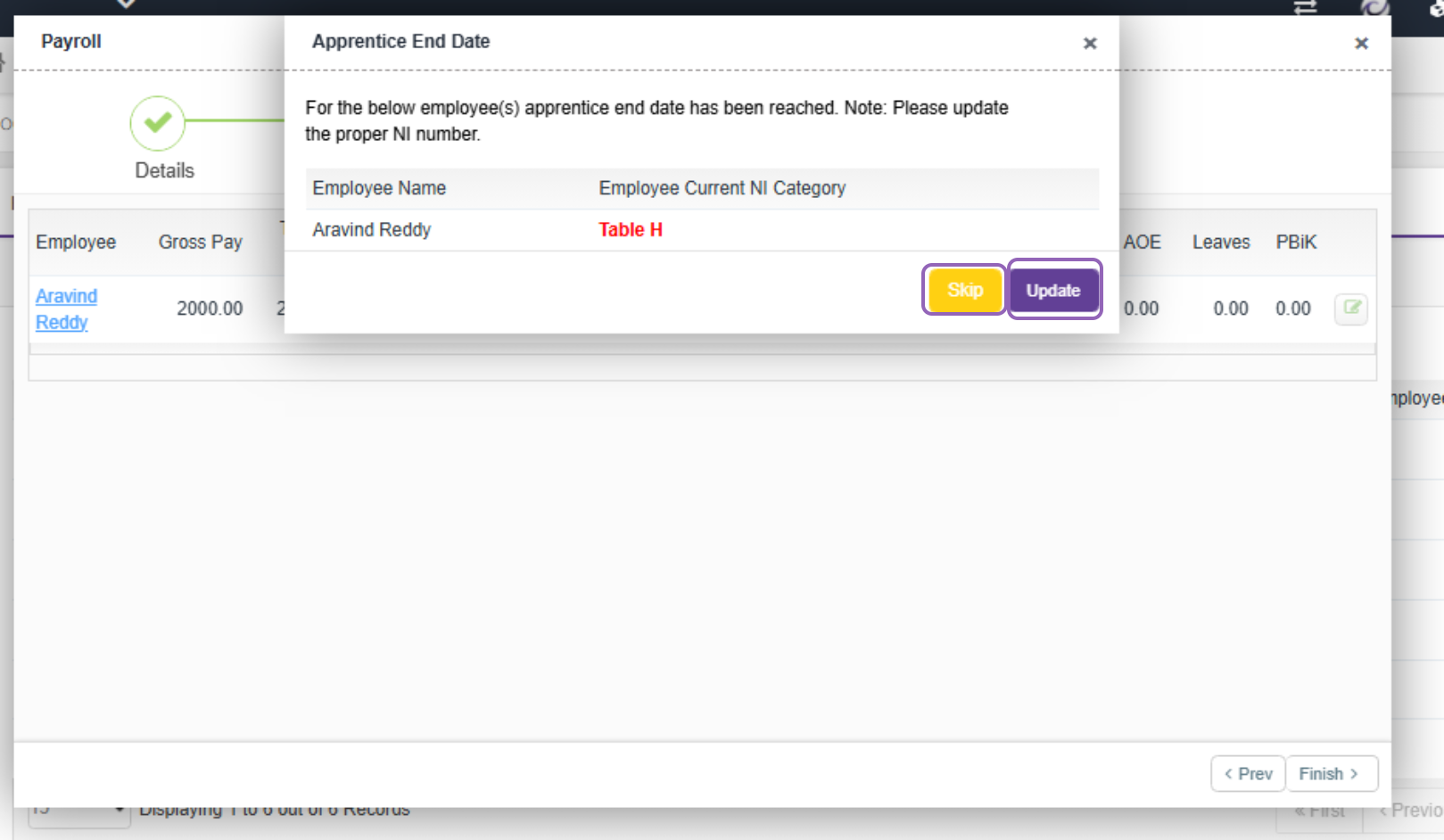 When the apprentice end date is reached, a pop-up will appear. You can select Update to change the employee’s NI Category, or choose Skip if you’d prefer not to update and continue running payroll.