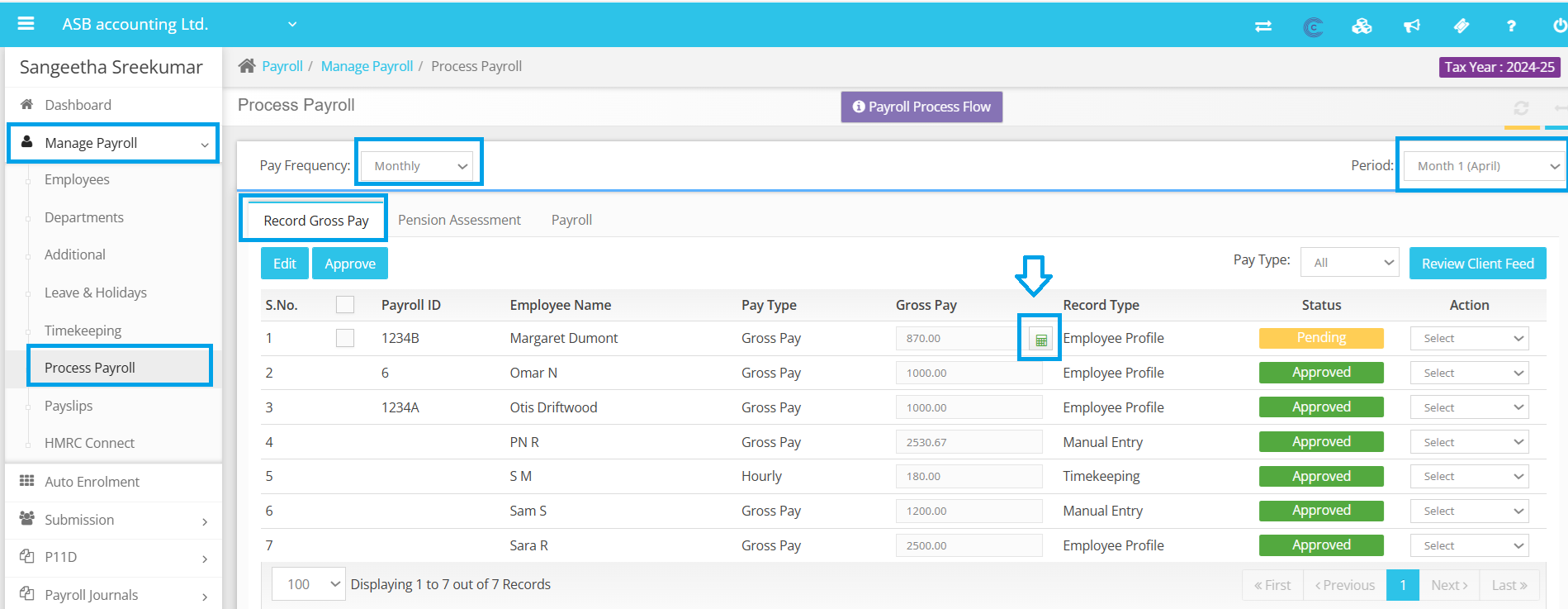 5. Click on the Calculator Icon: Once you have found the employee, look for the calculator icon next to the gross pay field (Status should remain pending to see the option). Clicking this icon will open a new window where you can enter specific payment details.
