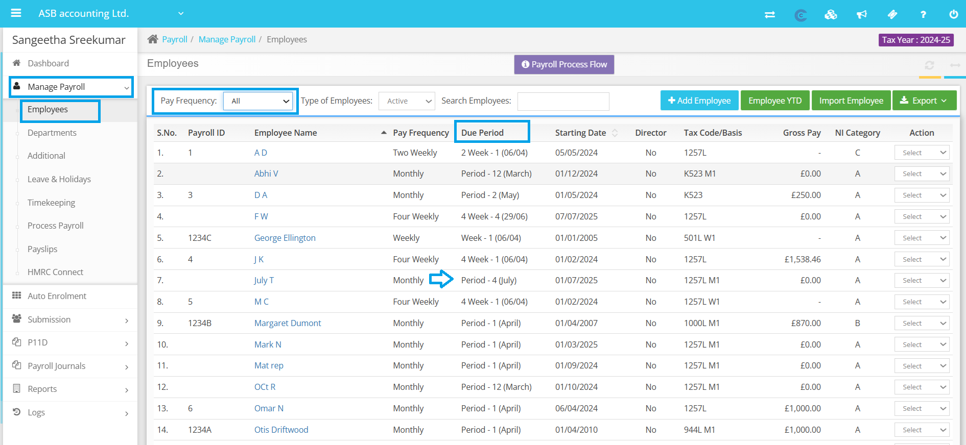 - Lastly, check that the due period is accurately updated by navigating to Manage Payroll >> Employees. It's important to ensure that the due period is correctly updated to include the employees for the payroll processing.