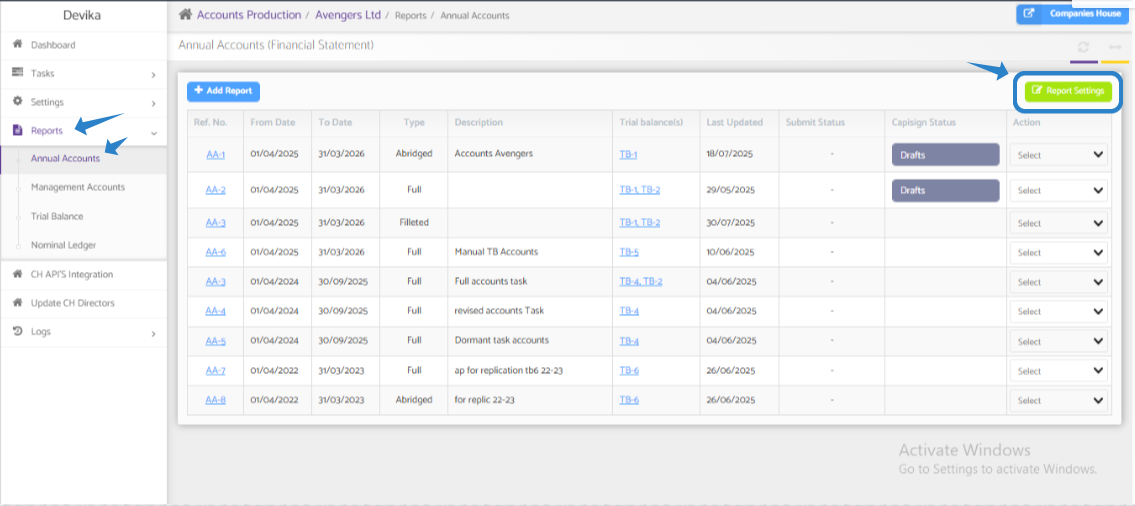 5. Report Settings: Once you have selected the Annual Accounts report, refer to the attached document for further instructions on accessing the Report Settings.