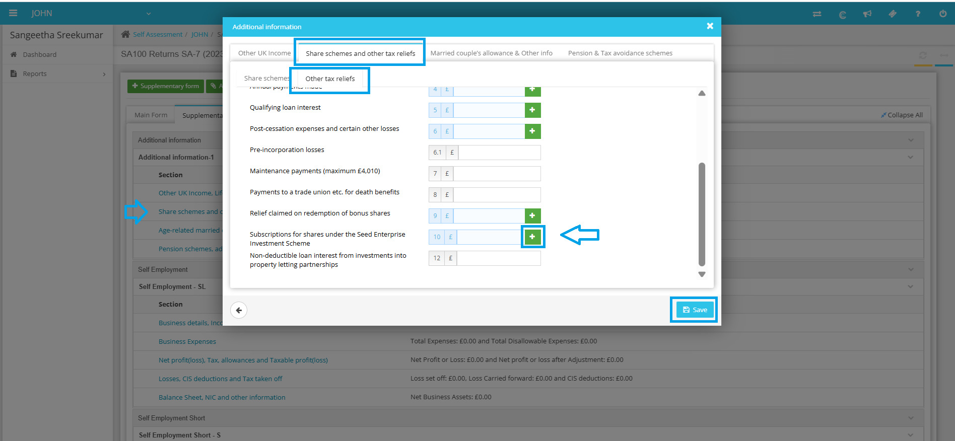 2. Update the figures at Share schemes and other tax reliefs >> Other tax reliefs >> Box 10.