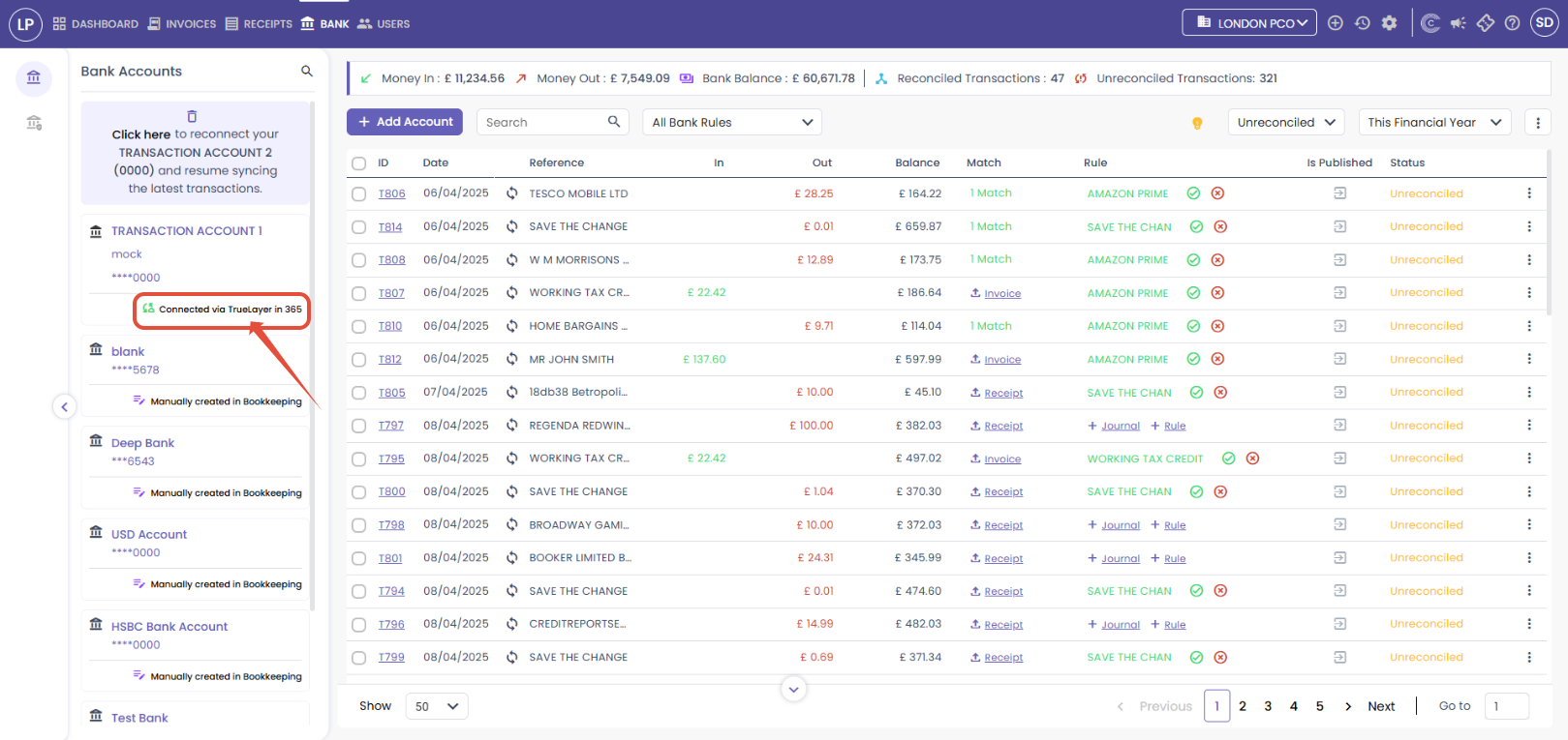To reauthenticate your bank accounts in Capium 365, click the 'Connected via TrueLayer in 365' button (shown in the picture below). This will reauthenticate the specific bank account in Capium 365 once it has been imported from the bookkeeping module.