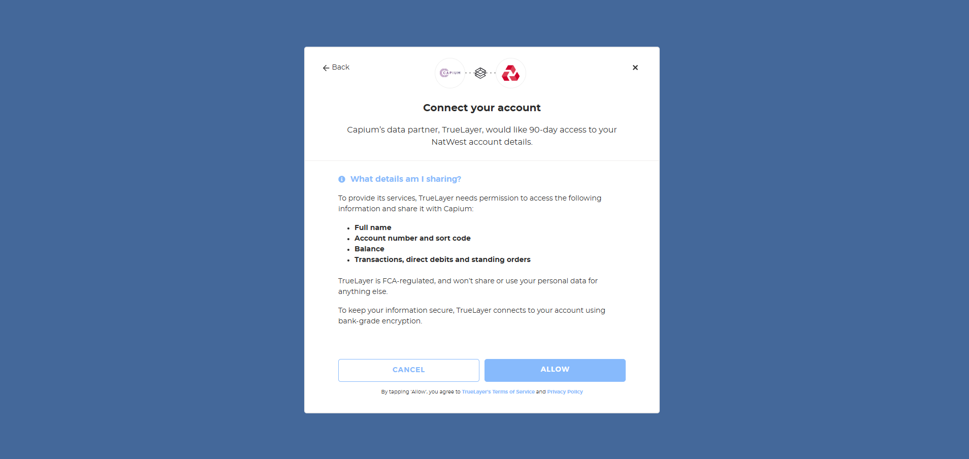 Click 'Allow' to connect the bank account. You will then need to enter your login details on the next page. Once completed, TrueLayer will securely connect the bank account to the client you are working on.