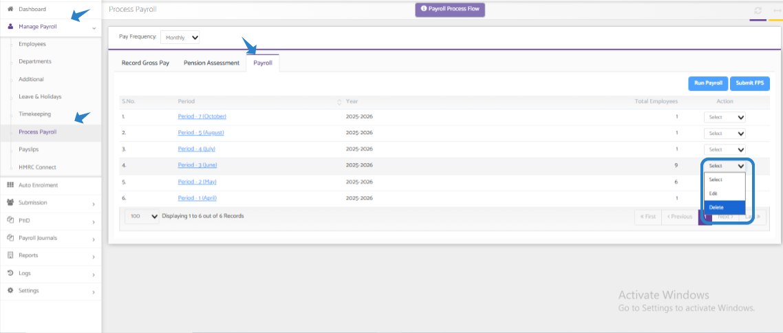 2.Once done, you may proceed to Manage Payroll >> Process Payroll >> Select action >> Delete, to remove the previously executed Payroll.