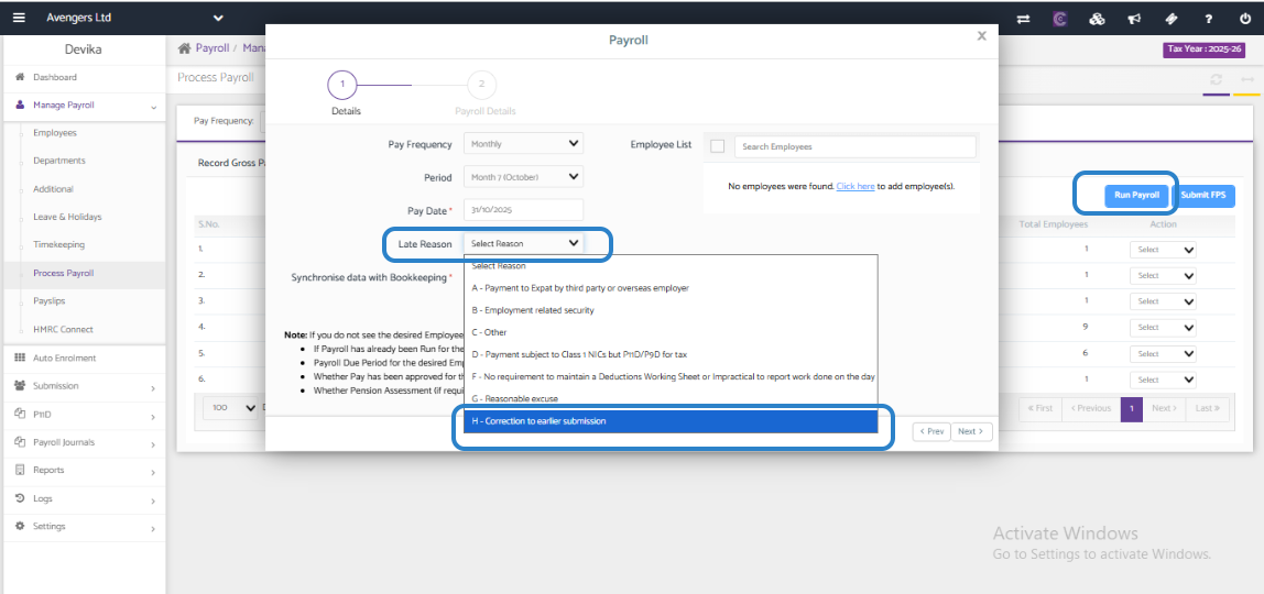 3. After making the required changes, you can re-run the payroll by selecting the late reason as "H - Correction to earlier submission" from the drop-down menu under 'Late Reason'. This will ensure that the amended submission is properly categorized.