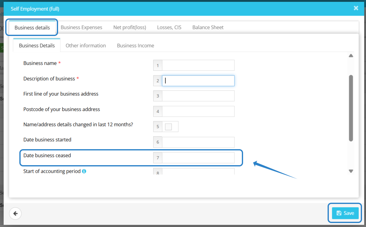 To update the cessation date of your business, please navigate to the Self Employment page >> Business Details >> Box 7 (Full form)/Box 6 (Short form): Date business ceased >> Update the details >> Save.