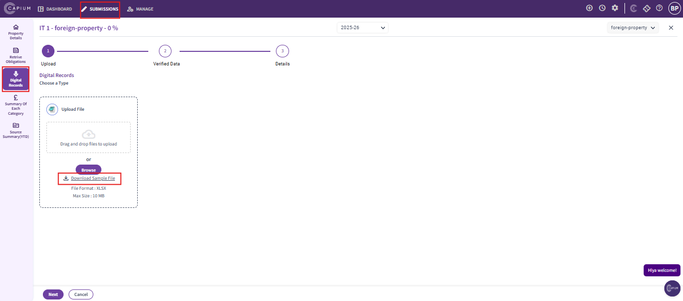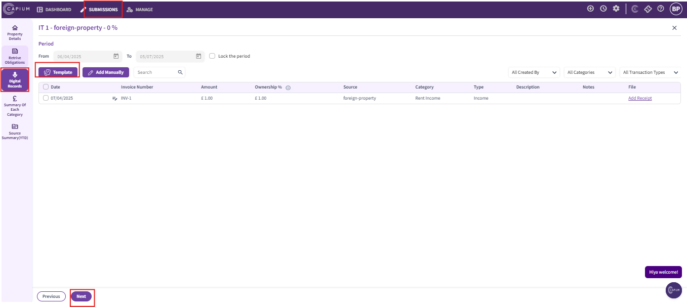 Navigation : MTD IT > Submissions > Client specific > Select view & Submit > Digital records > Template