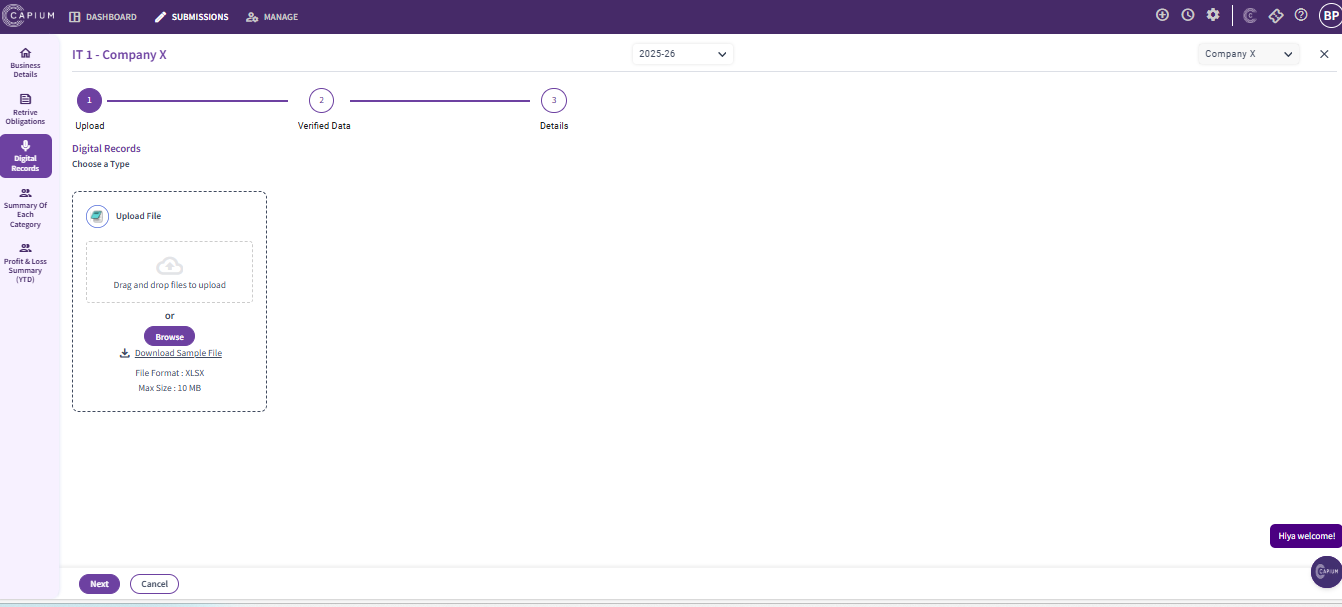 Navigation : MTD IT > Submissions > Client specific > Select view & Submit > Digital records > Template