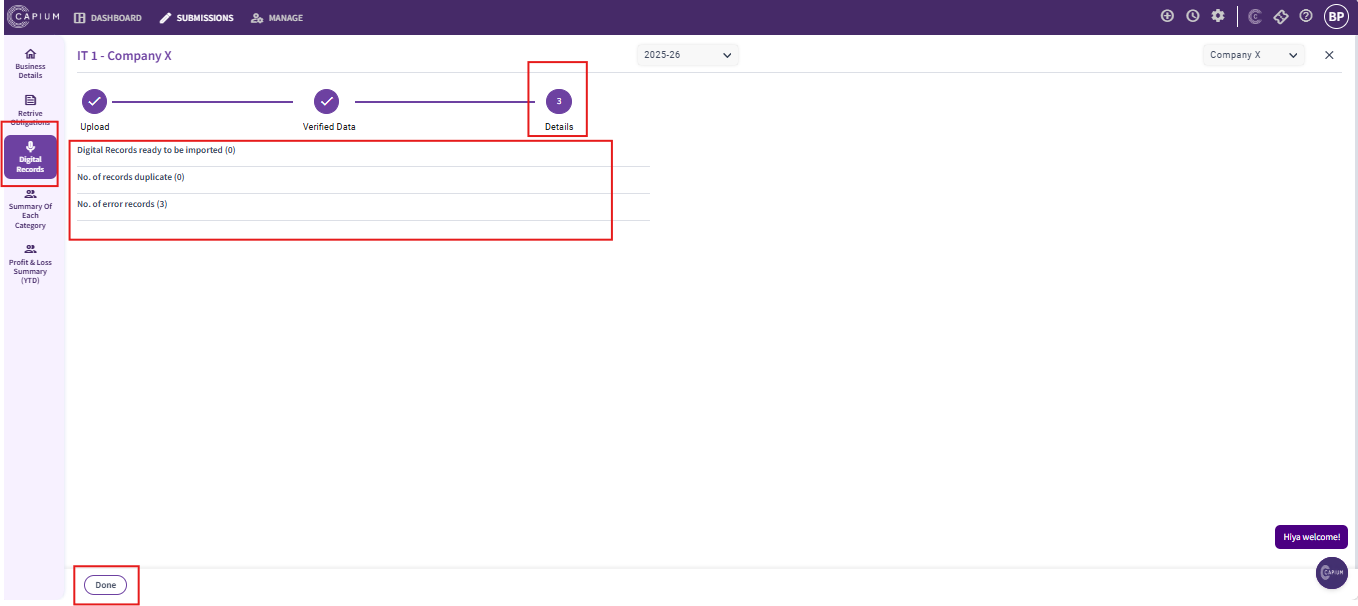 Once data is verified all the transactions would be imported and details would pop up as shown below and select the option ‘Done’.