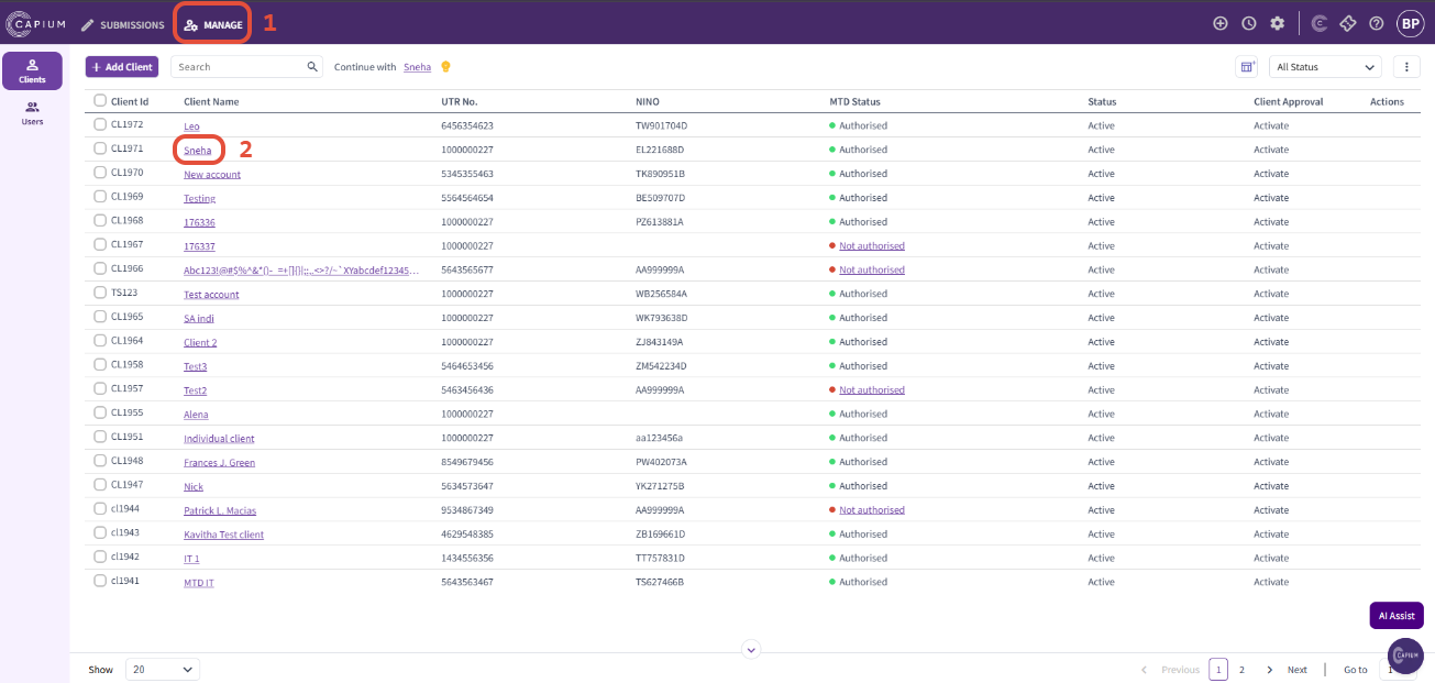 Firstly, navigate to the Manage section and select the client you want to enable client approval for.