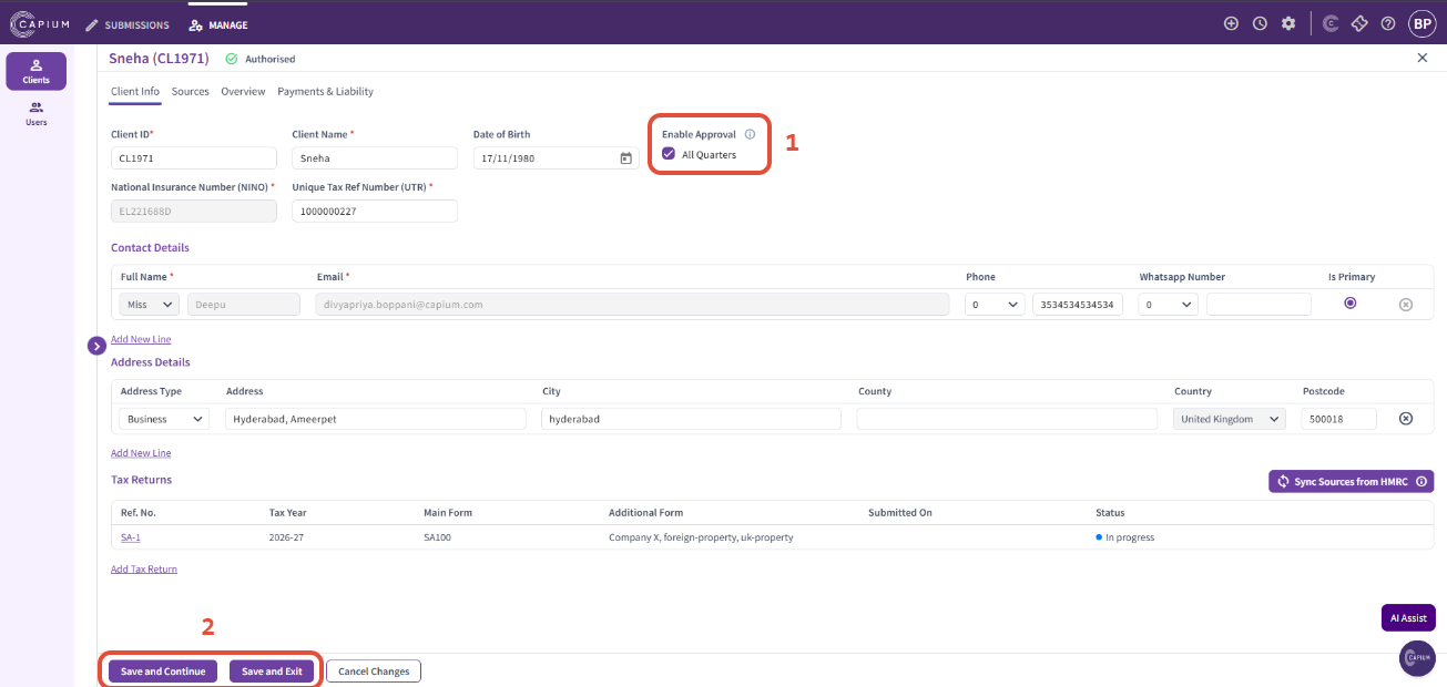 Once you are in the client specific area, click on the check box labelled “All Quarters,” then click Save. This will enable client approval in the submission section.