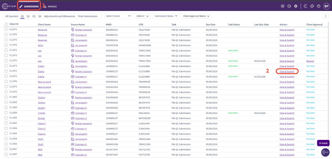 Once you have enabled client approval, navigate to the Submissions section and click on View and Submit for the client you want to request approval from. This can be done for both quarterly submissions and the final submission.